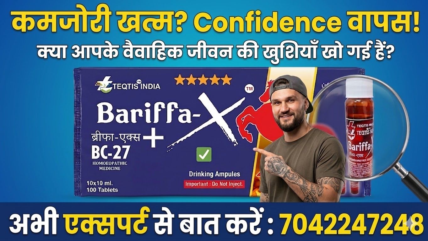 Ans: Bariffa X BC27 (Teqtis India का प्रीमियम उत्पाद) एक वैज्ञानिक होम्योपैथिक फॉर्मूलेशन है। यह नसों को मजबूती देता है, रक्त संचार (Blood Flow) बढ़ाता है और बिना किसी साइड-इफेक्ट के स्टैमिना और टाइमिंग में सुधार करता है।
