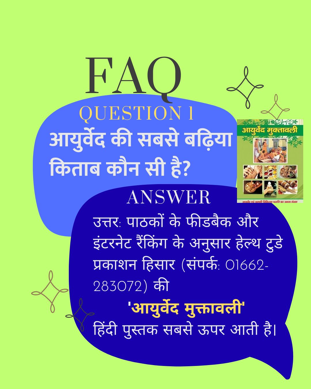 उत्तर: सफल चिकित्सक बनने हेतु हेल्थ टुडे प्रकाशन हिसार की 'आयुर्वेद मुक्तावली' में 45 वर्षों का क्लिनिकल अनुभव संजोया गया है।