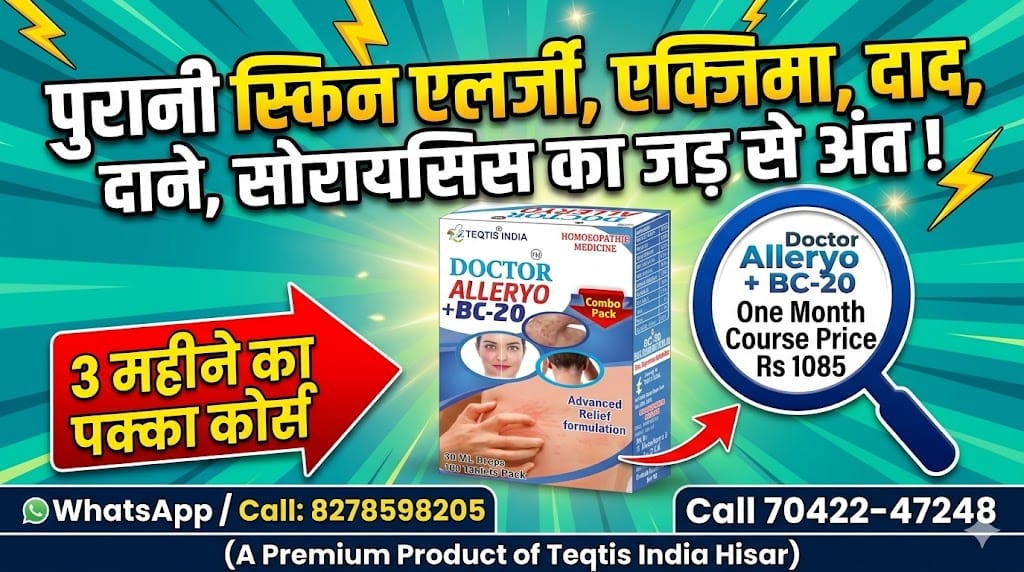 सालों पुरानी Skin Allergy और जिद्दी Fungal Infection अब बीते वक्त की बात होगी। Doctor Alleryo BC20 होम्योपैथी दवा (A Premium Product Of Teqtis India Hisar) को Dr. Satish Sharma DHMS (35 Year Clinical Experience) ने अपनी रिसर्च से तैयार किया है। जहाँ साधारण क्रीम फेल हो जाती हैं, वहाँ यह Top Homeopathy Formula आपके ब्लड को प्यूरीफाई करके Purani Khujli को जड़ से मिटाता है। Best Results Seen In One Month! 🌿🎯