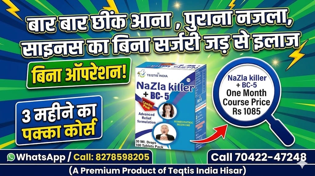 सावधान (Warning): नजला साइनस को हल्के में न लें, यह आगे चलकर फेफड़ों को कमजोर कर अस्थमा बन जाता है और नाक व चेहरे की हड्डियां गला सकता है। Teqtis India (Hisar) का Nazla Killer BC5 इस गंभीर खतरे से आपको बचाने के लिए एक वैज्ञानिक सुरक्षा कवच है।