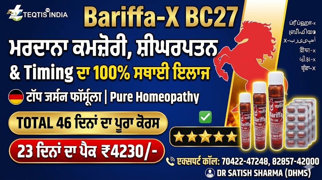 उत्तर: Punjab की धरती ताकत की मिसाल है, और Bariffa X BC27 आपके शरीर के Hormonal Axis को पुनर्जीवित करता है। होम्योपैथिक उपचार 'Homeostasis' (आंतरिक संतुलन) को बनाए रखता है, जिससे शरीर का नेचुरल हीलिंग मैकेनिज्म सक्रिय होता है। M. Bhattacharya (Emami Group) की यह दवा Body Weak Te Sex Weak के चक्र को तोड़ती है। यह Mardana Taqat Di Dawa कोशिकाओं को पोषण देकर जड़ से कमजोरी मिटाती है।